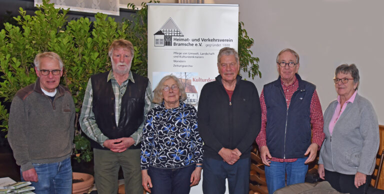 Der Vorstand des HVV (v.l.n.r.): Michael Gottlieb (stellvertr. Vorsitzender), Gerhard Müller (Vorsitzender), Waltraud Hinz (Wanderwartin), Dr. Rainer Drewes (Schriftführer), Thomas Kaes (Archivleiter), Elke Panzer (Kassenwartin)Bildunterschrift